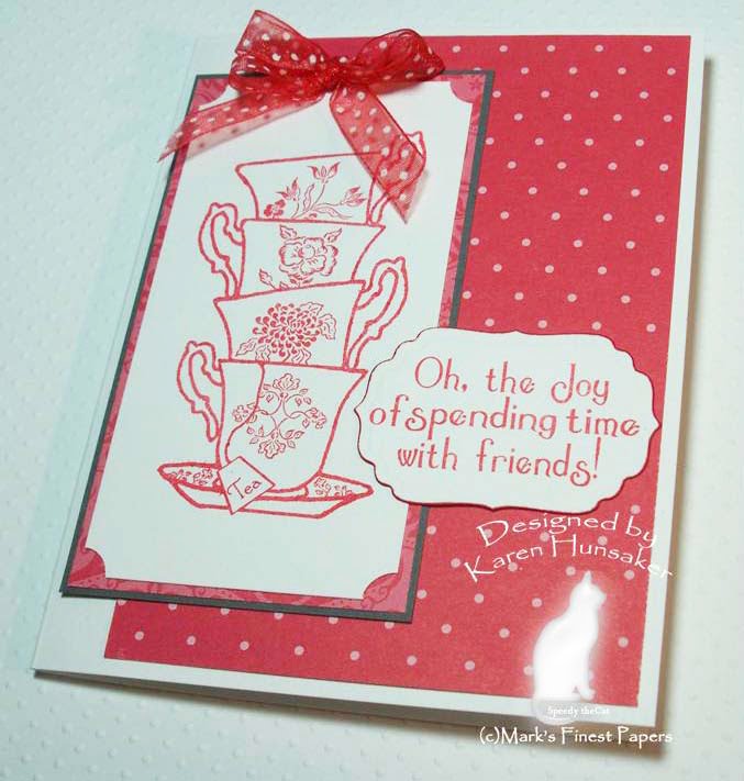 I love this new sentiment I recently got from Rubbernecker. I do amuse myself all the time. I stamped the sentiment using Barn Door distress ink onto white, cutting/embossing with a Spellbinders oval and mounting that on the black scalloped oval. I love the ruffled red gingham ribbon, don't you? That is mounted onto the ladybug paper from The Paper Company Studio and then onto the red cardstock.